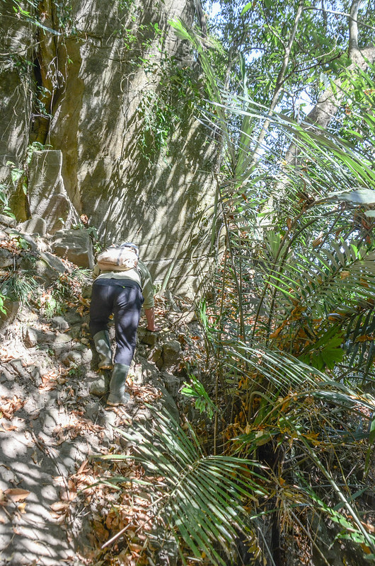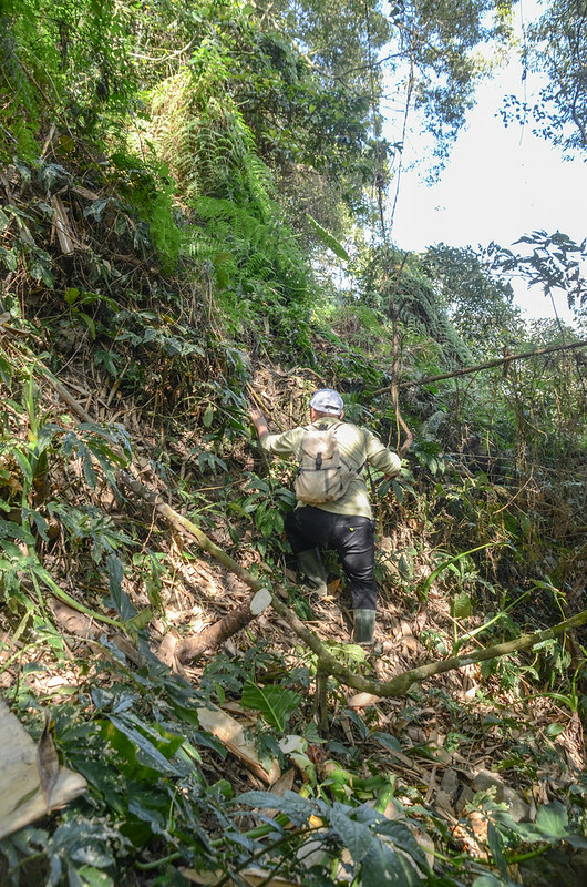 此後一路在長滿蕨類及蕁麻科植物的陡坡上爬升,其間又有多處危險橫切及陡攀路段,幸好在茂密的植被下找到幾段早期山友或筍農留下的拉繩才得以順利上行,否則能否順利登頂都還在未定之數。