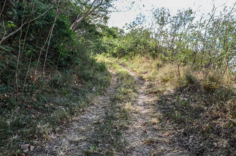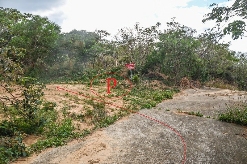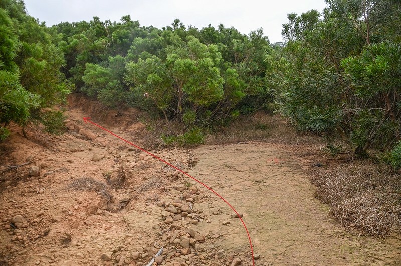 四輪傳動車可續行950公尺至“核三-大鵬二路057”,我嘗試開車上行,50公尺遇岔路取左行,再行約50公尺車子打滑上不去將車停於保線道右彎處路左空地,座標220298 2446129,海拔75公尺。