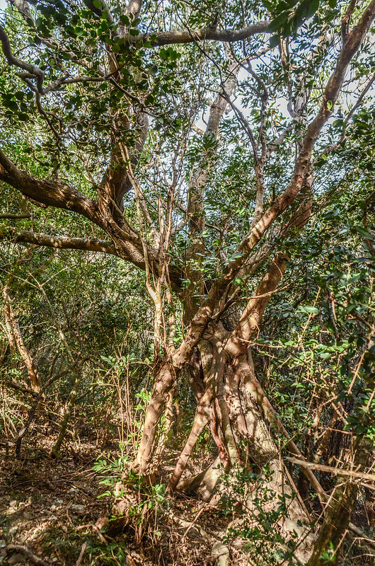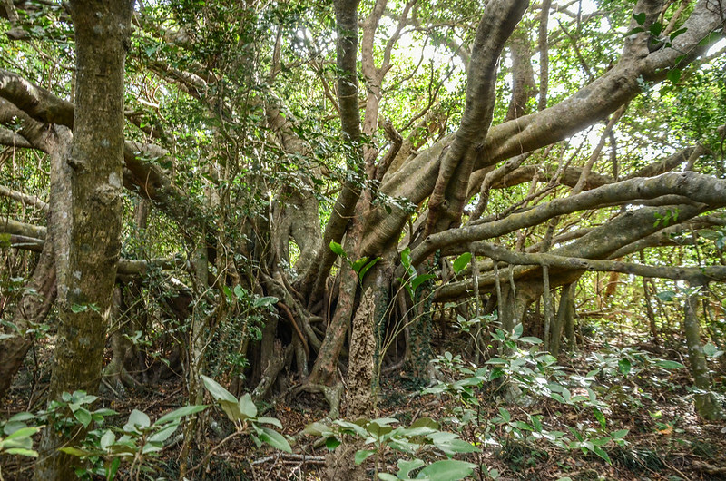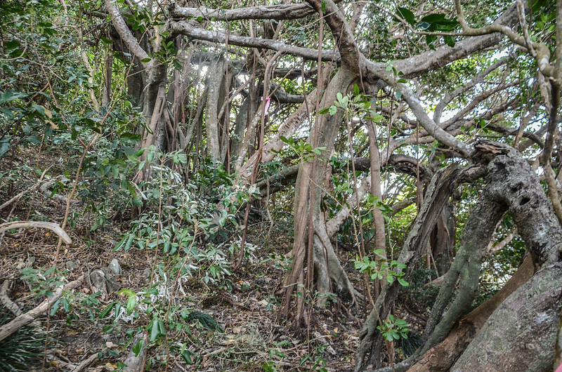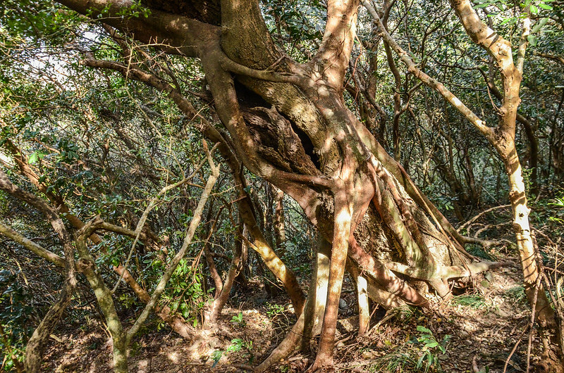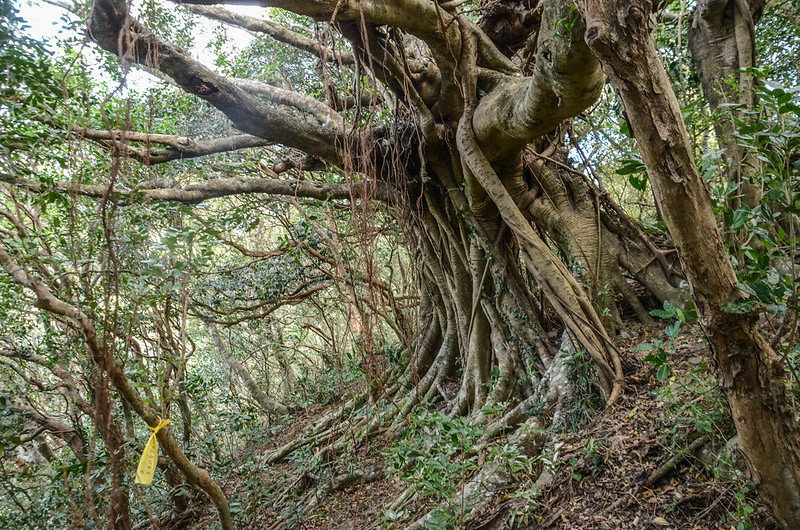 10:51 登上稜線,座標220664 2446123,海拔269公尺;沿著稜線朝東北行,稜線上又見到幾棵較大棵的多氣根榕樹,由多氣根榕樹左側腰繞而過。