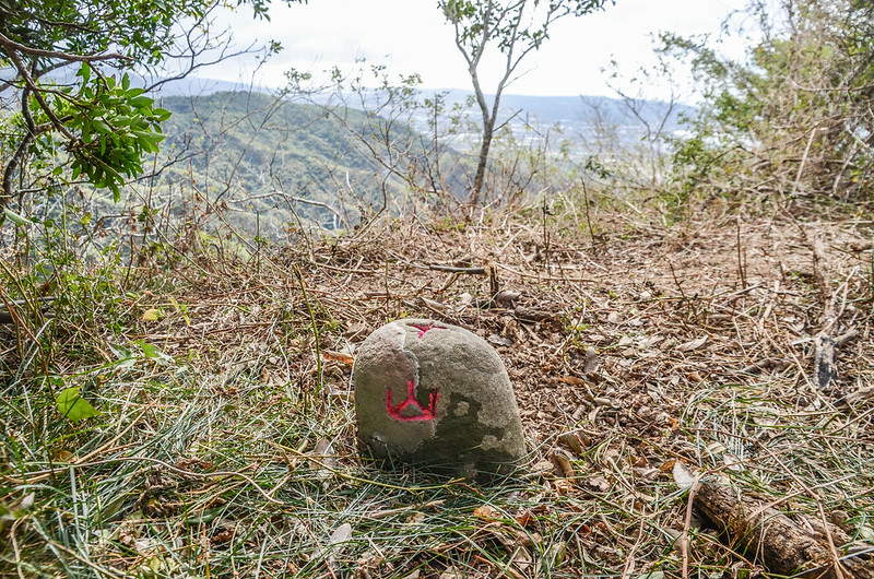 此顆自然石跟以往見過的自然石有些不同,它仿照一般山字森林三角點的刻法,北面刻一“山”字,南面刻“森林三角”(點字已風化嚴重看不清楚),頂端刻一“十”字,而通常見到的自然石大都簡單刻個“十”字,頂多再加個“山”字或該點的冠字,像這顆刻的這麼完整的除了多年前造訪的屏東牡丹的港仔山西(該顆自然石刻有“三角殖產局”及“山”字)外,這是第二顆刻的最完整的自然石!