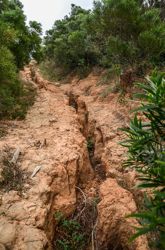 此後一段路路中間遭雨水沖刷成深溝,靠著深溝兩邊狹窄邊緣小心上行;