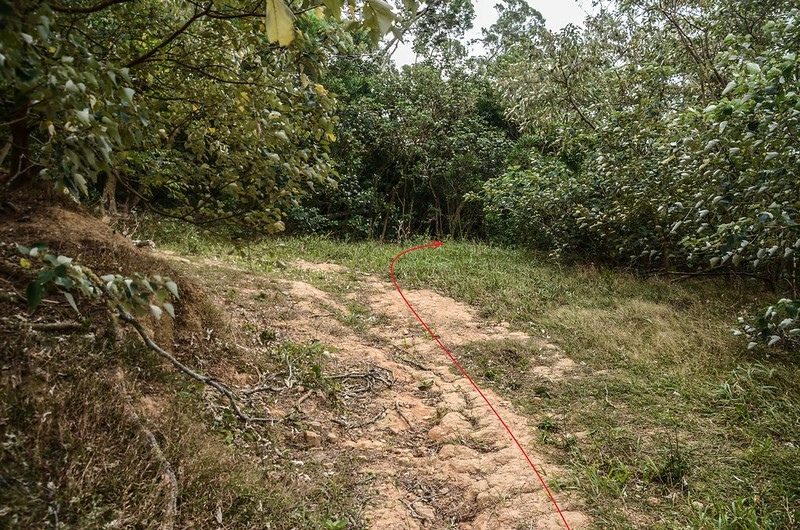 13:35 岔路,地面紅漆箭頭指向右岔不取,取左岔樹上綁有路條岔路上行,座標219406 2450785,海拔359公尺,距停車處約850公尺;
