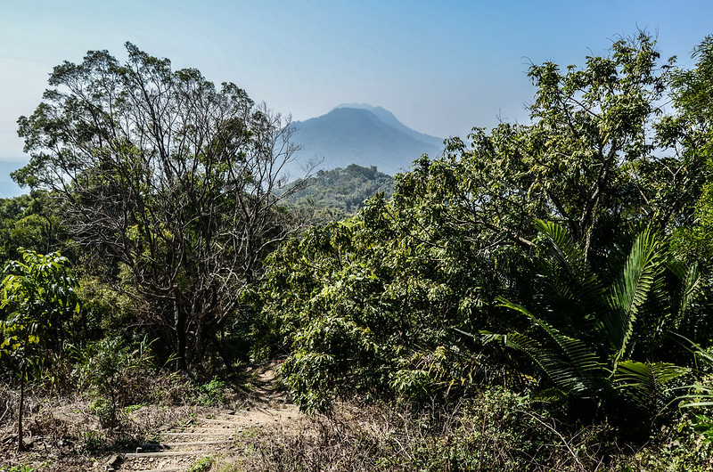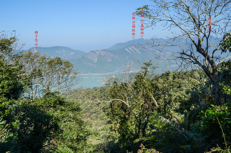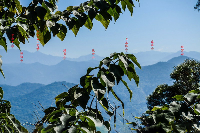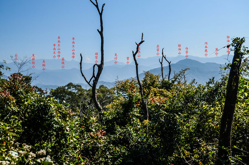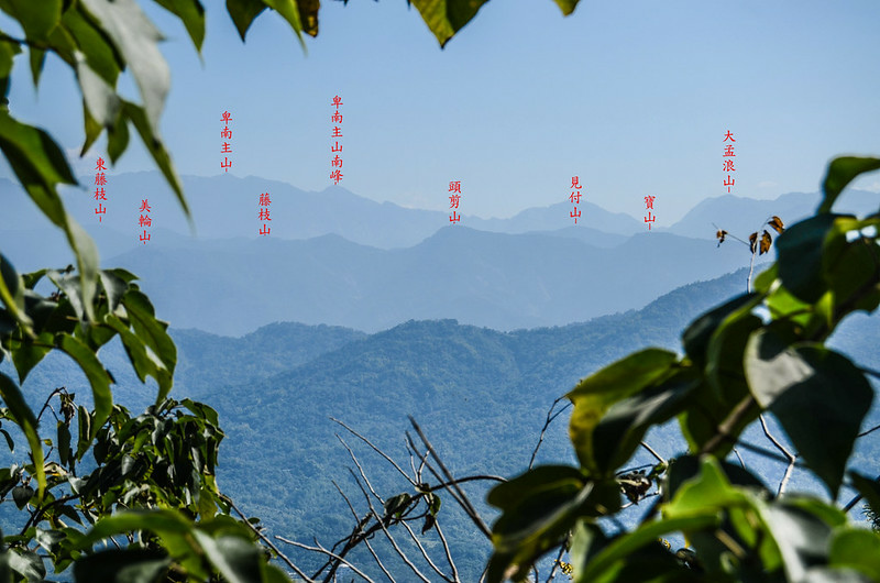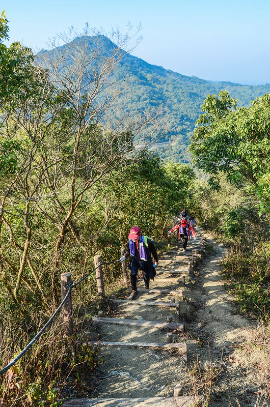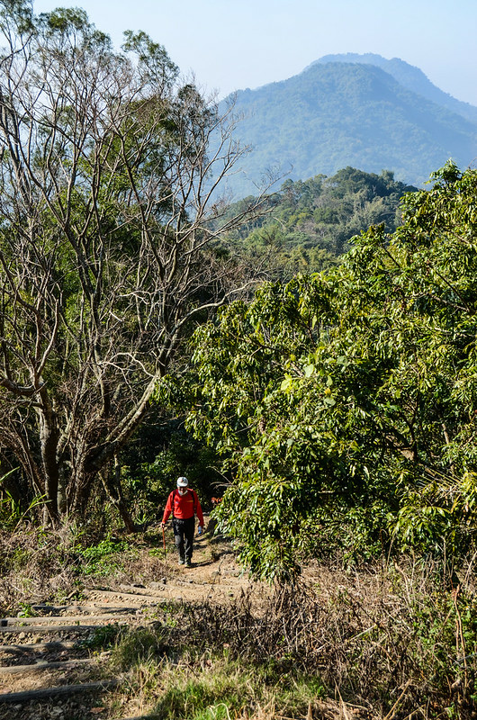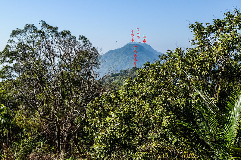 過了觀壩亭不遠步道又開始陡坡爬升,回首西南望烏山連稜,此地海拔較高故可望見烏山、刣牛湖山及風空子山。