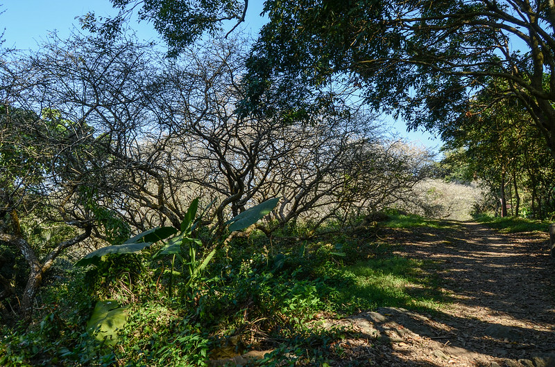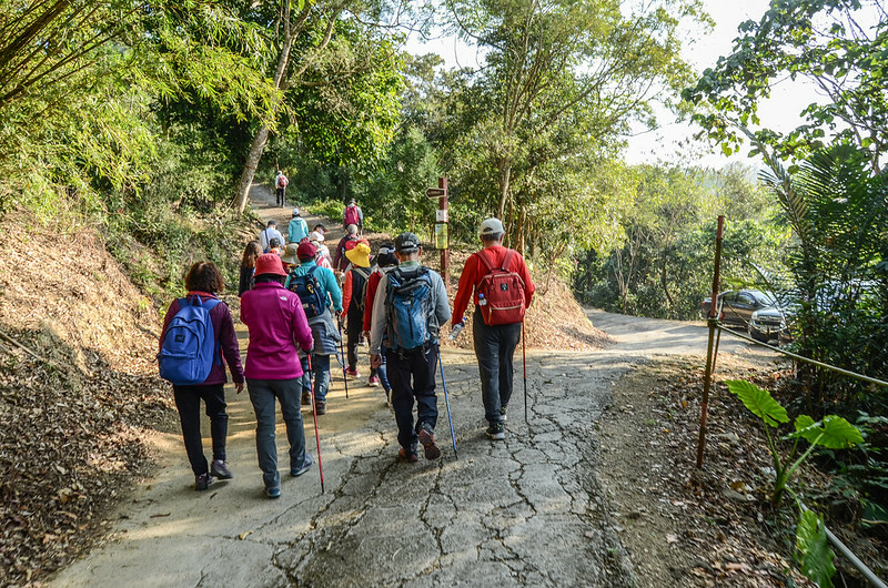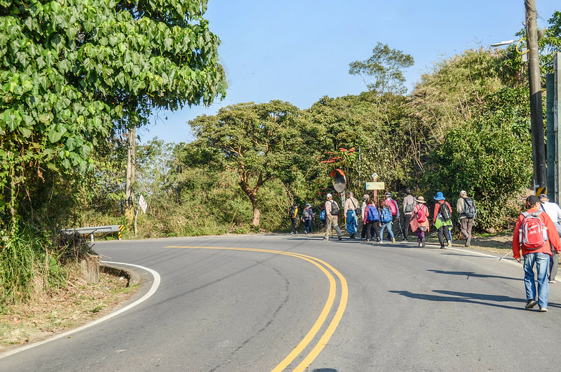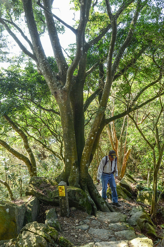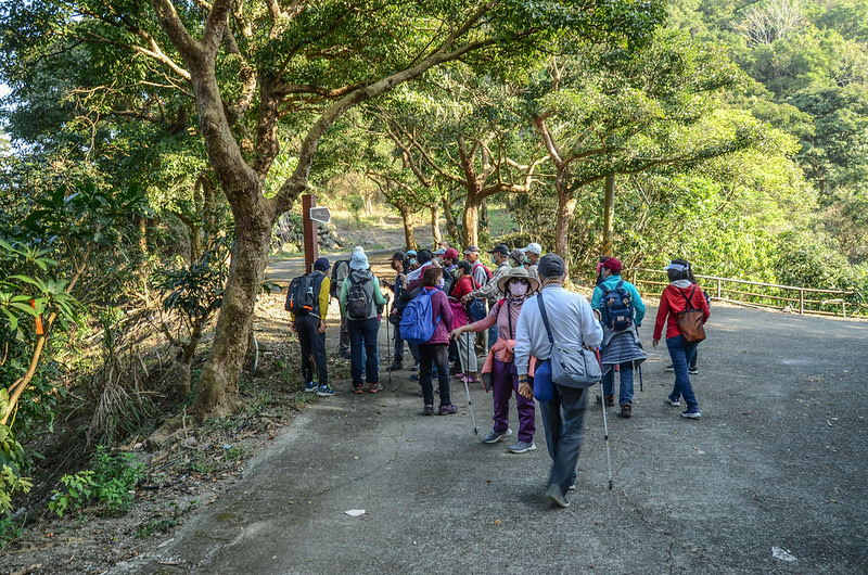 08:46 台20線52.35K紫霞登山口入口起登,進入兩旁種植茄苳樹的水泥路行數十公尺遇右岔路不取,取左較小岔路上行。