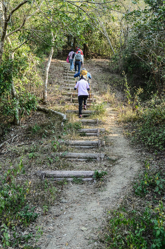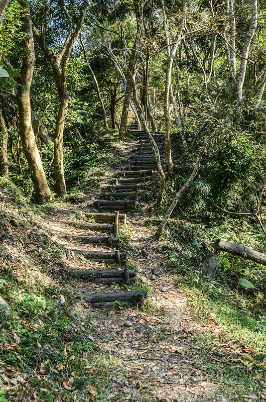 離開崖邊觀景點後續前行,取左上坡仿木紋樁階梯上行,坡度有點陡,左側仍是南化水庫及糖子恩等山一路相陪。