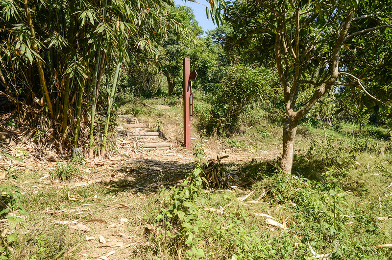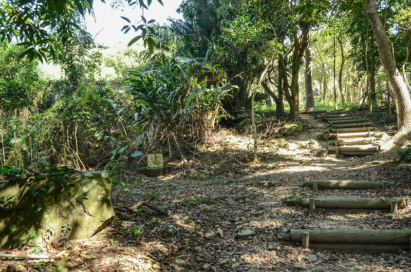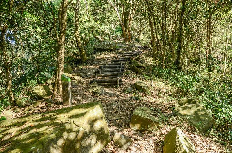 09:48 登上陡坡高點,路旁有一根步道2.5K的里程樁,座標204461 2553453,海拔610公尺;過了步道高點又是一段緩平的步道,旁有產道岔路不取,一路沿仿木紋樁階梯路面上行。