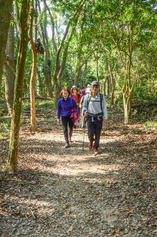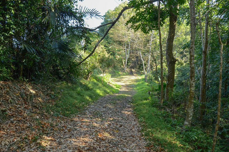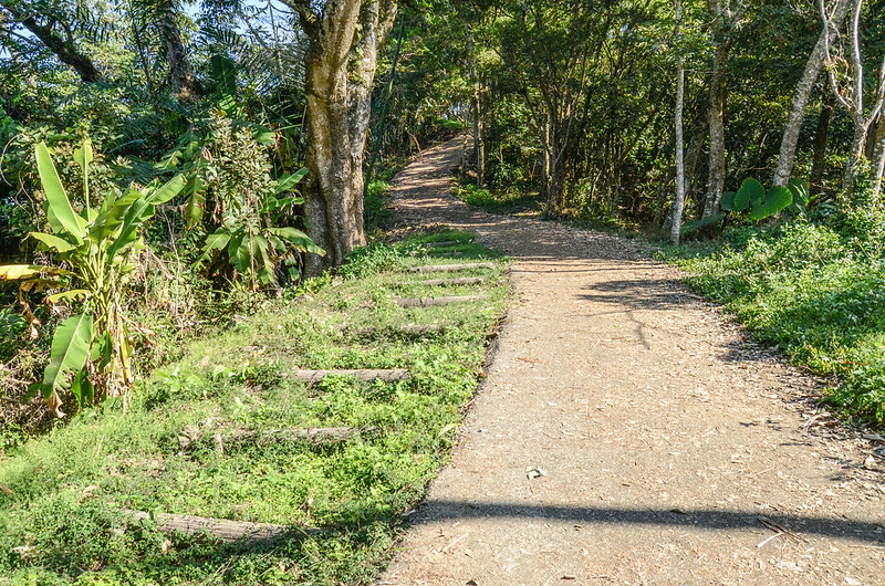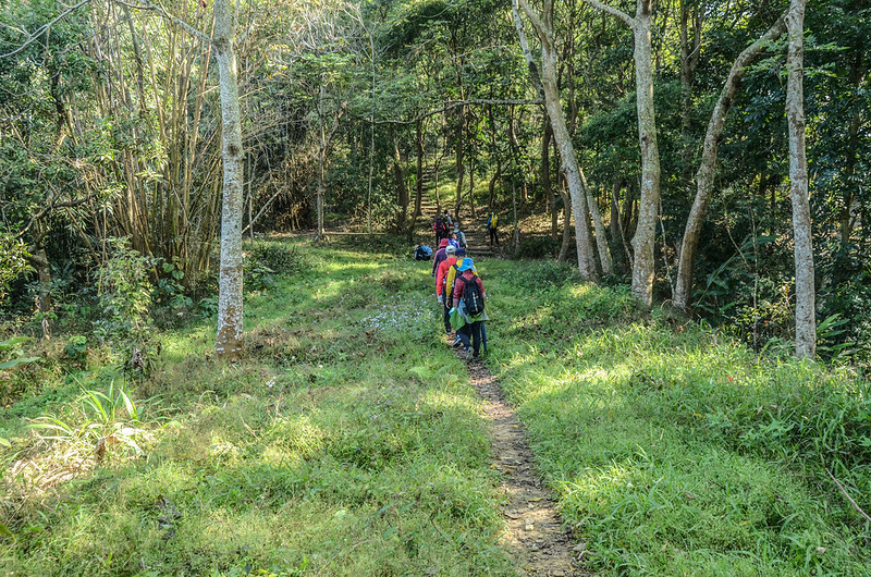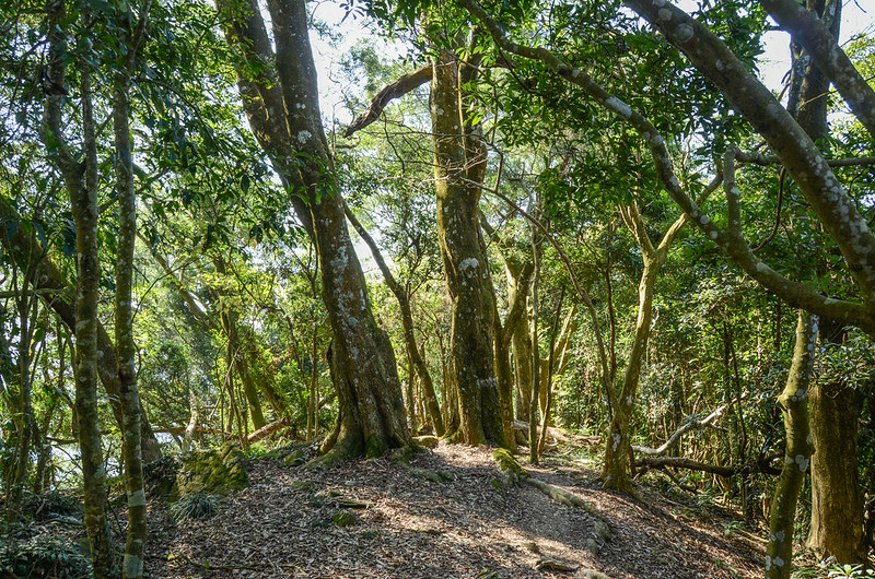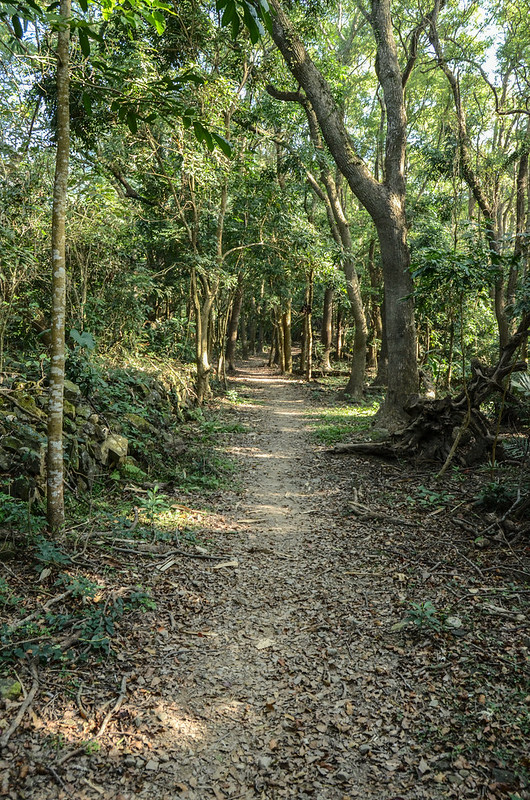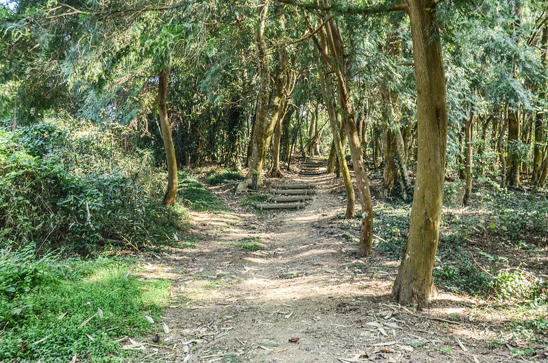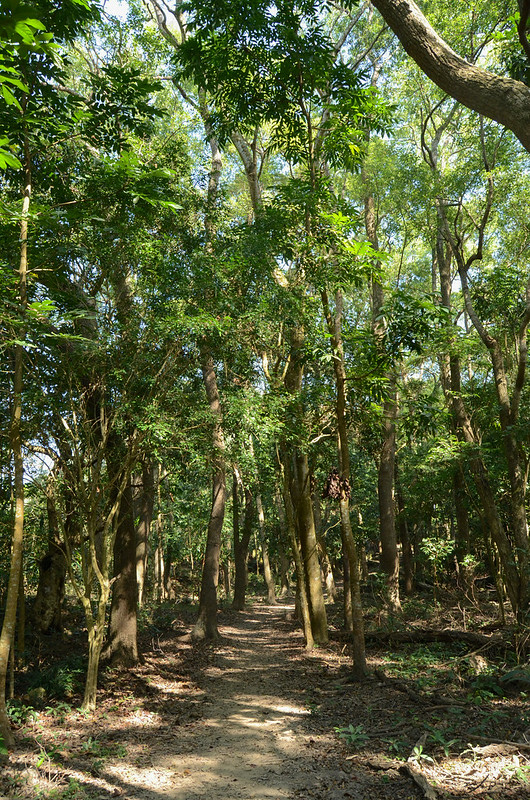 離開小台地後步道有點小上坡,隨即來到樟樹林步道,兩旁是筆直的樟樹林,長約百公尺,行走其間異常舒服。