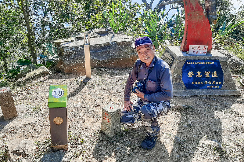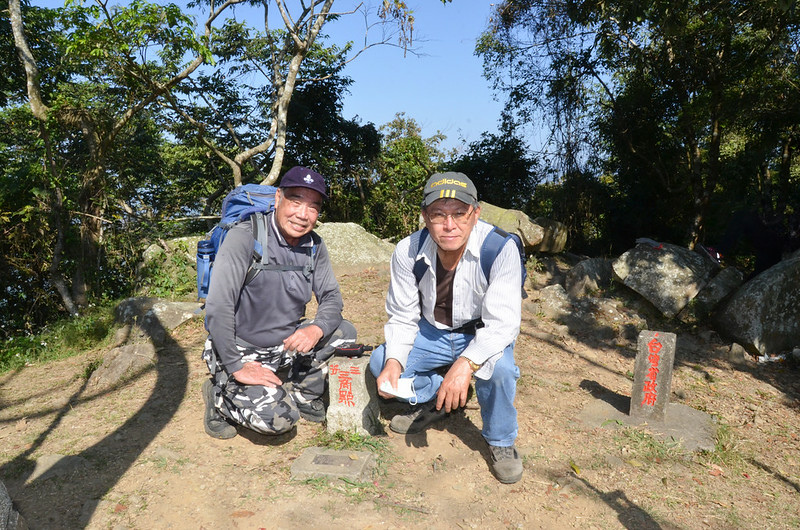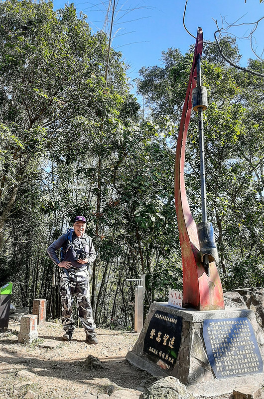 09:28 登上六義山南峰(吳酒桶頭南峰),海拔540公尺,山頂立有一顆冠字補山(18)的山字自然石森林三角點,座標204029 2553055;