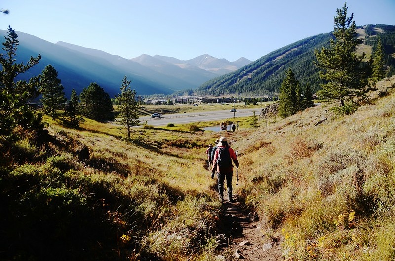 沿著I-70北側山坡小徑西南行,步道左側隔著I-70州際公路對面是Copper Mountain Ski Resort,右側山坡上白楊木葉子已轉黃,在晨光照耀下鮮豔耀眼。