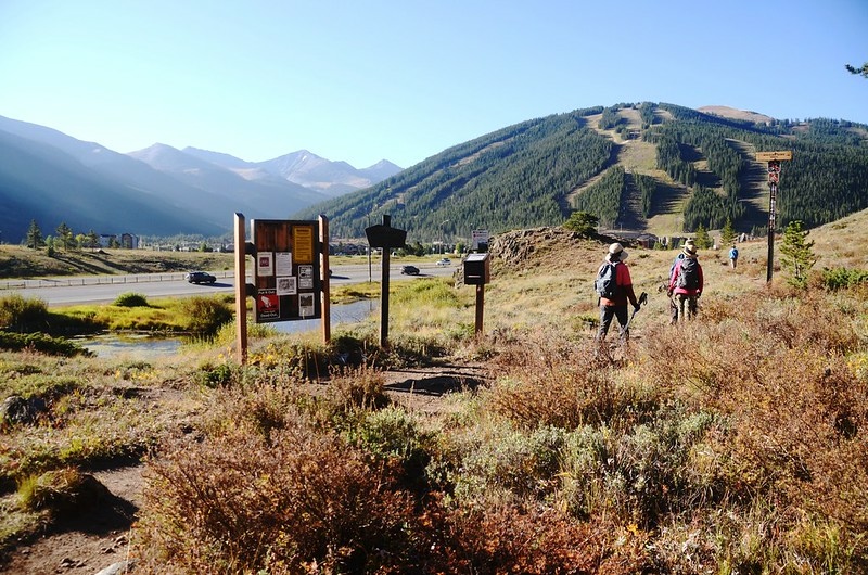 先右下跨過一座木橋後上抵一面White River National Forest解說牌岔路處,取左沿I-70西側山坡下寬敞步道南行;