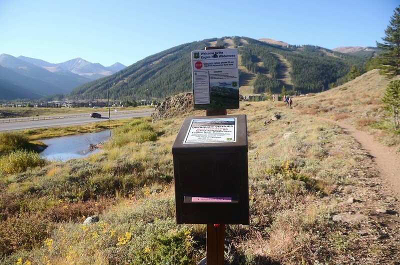 由丹佛沿I-70州際公路西行,行約64哩後於Exit 196下交流道停車於Scenic area,座標N39.51799° W106.14682°,海拔9,699呎/2,956公尺,停車處南端即是Gore Range Trail登山口。