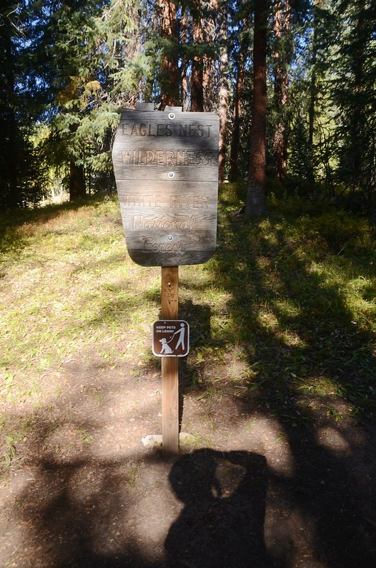 09:18 路左立有一面Eagles Nest Wilderness 的界線牌,座標N39.50644° W106.15577°,海拔10,170呎/3,100公尺,距登山口1.8哩/2.9公里;