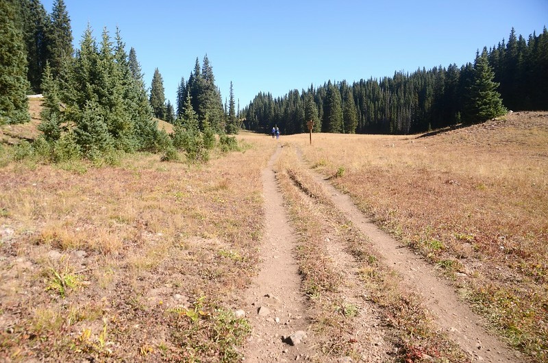 此處叉路無指標,如取左岔前行100呎/30公尺則有一根左往Gore Range Trail、右往Wheeler Lakes Trail的木製指示路標,取右小徑上至一片大草原後,沿大草原寬敞步道朝東北行。