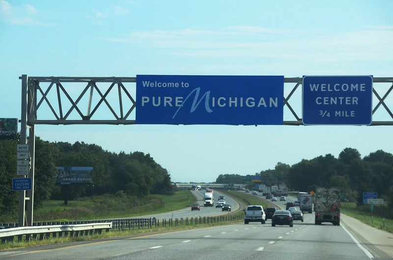 09:10 進入Michigan 州,Indiana & Michigan State Line座標N41.75930° W86.75230°,州界道路上懸有一面Michigan Welcome Sign;