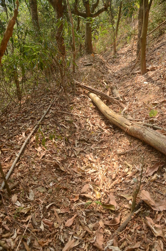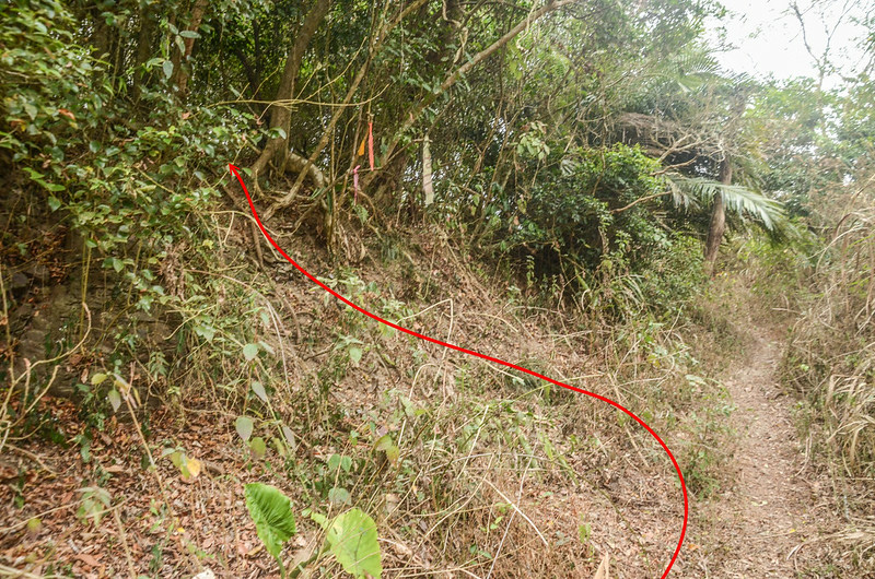 切入山徑後沿著已荒廢的古道朝西北上行約35公尺古道消失,取左雜林陡坡上攀,十餘公尺遇一乾溝峭壁,由右側稜線上攀,上行70公尺後遇一排水溝槽,溝槽邊有水管;
