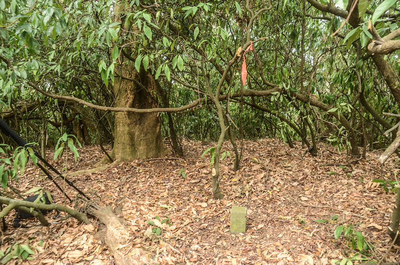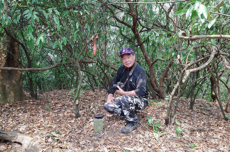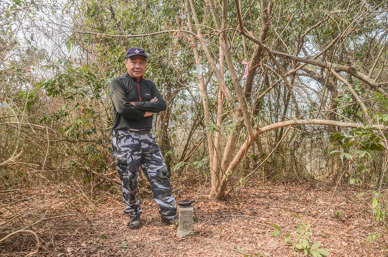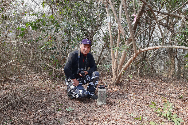 13:20 穿過馬纓丹叢後進入矮樹叢朝高點穿行5~60公尺抵達最高處找到著可芋山東南峰台灣省政府圖根補點,補點左後方兩2~3公尺左右有一棵大樹,現已將四周小灌木砍除;