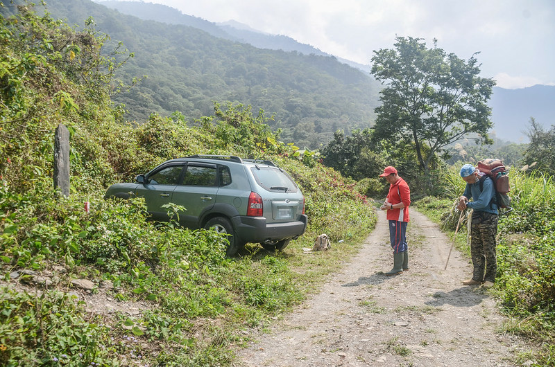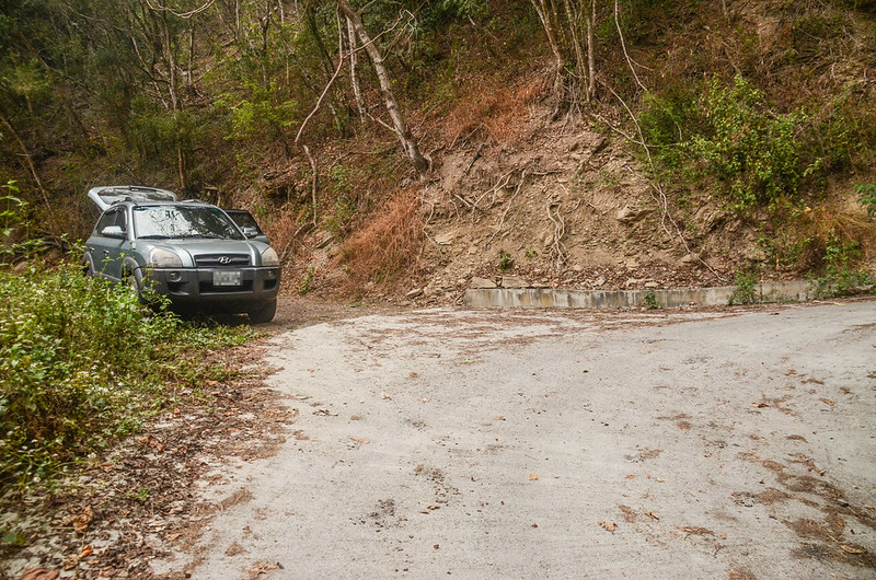 由日湯真西南峰停車處循原路回到林道4.0K岔路處停車,座標214608 2503611,海拔514公尺;車子還可往亞麻灣西峰岔路續行,但因不知近年路況如何保守一些走路上山。