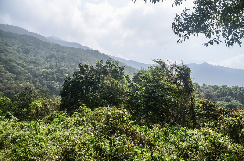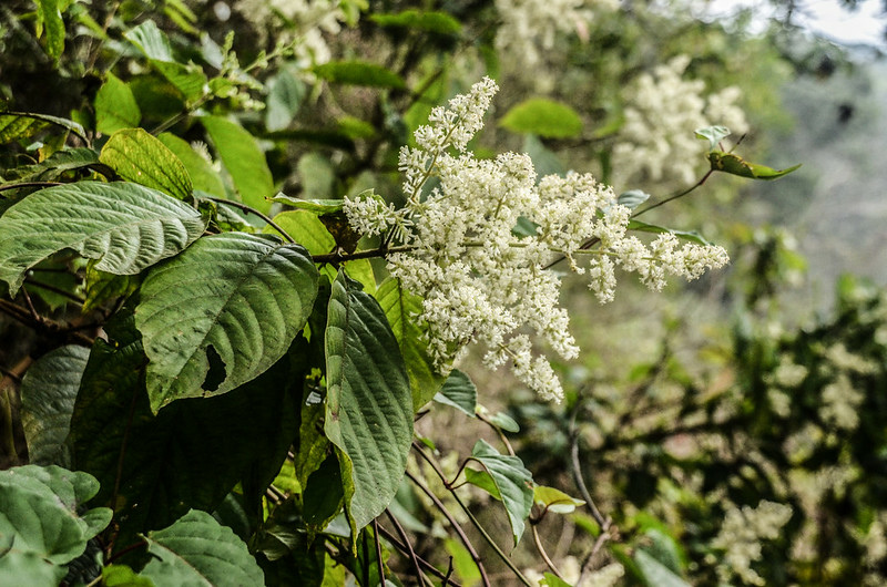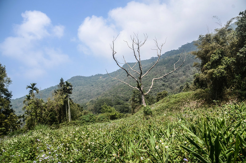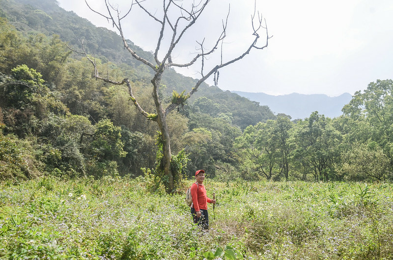 荒廢開墾地長滿野薑花但已被咸豐草(鬼針草)淹沒,右側山坡一大片樟樹林。