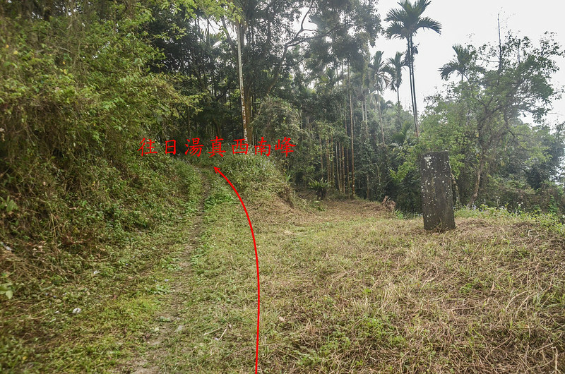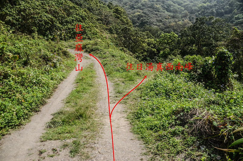 左岔主線續行往亞麻灣山,取右岔有點荒廢的小產道稍微下行往日湯真山西南峰,仍可行機車。