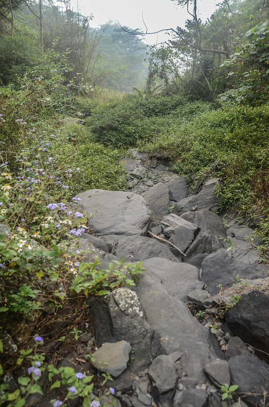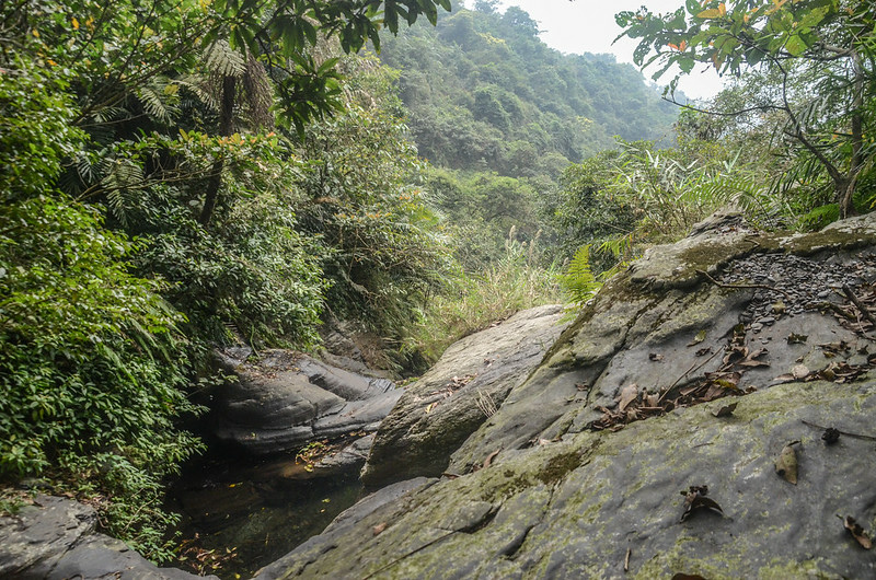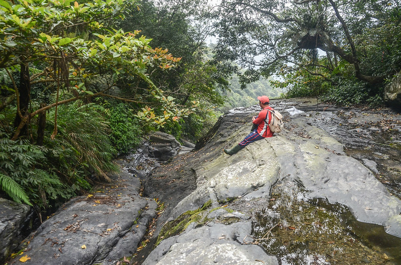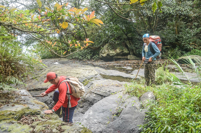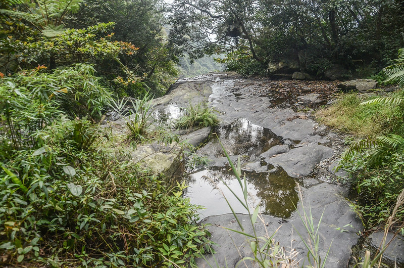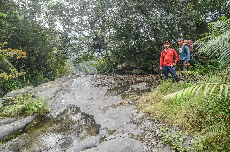 溪谷上一片巨大的大石盤,溪水由大石盤左側被切割的小溝槽流過,枯水期幾乎無流水,此山雨季不宜;