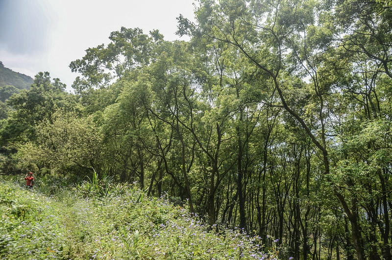一路沿著稜線明顯的山徑及路條下行,左下方是萬安溪的支流。