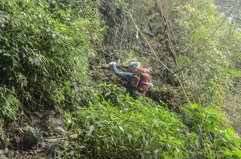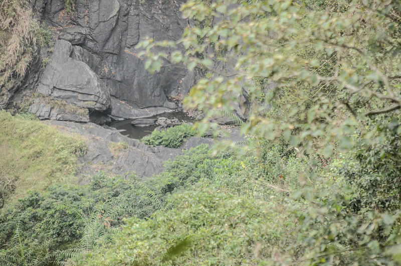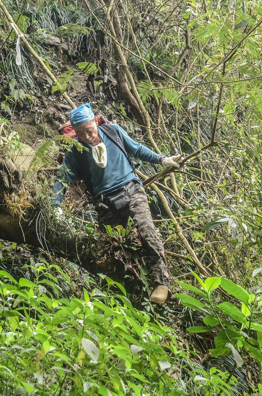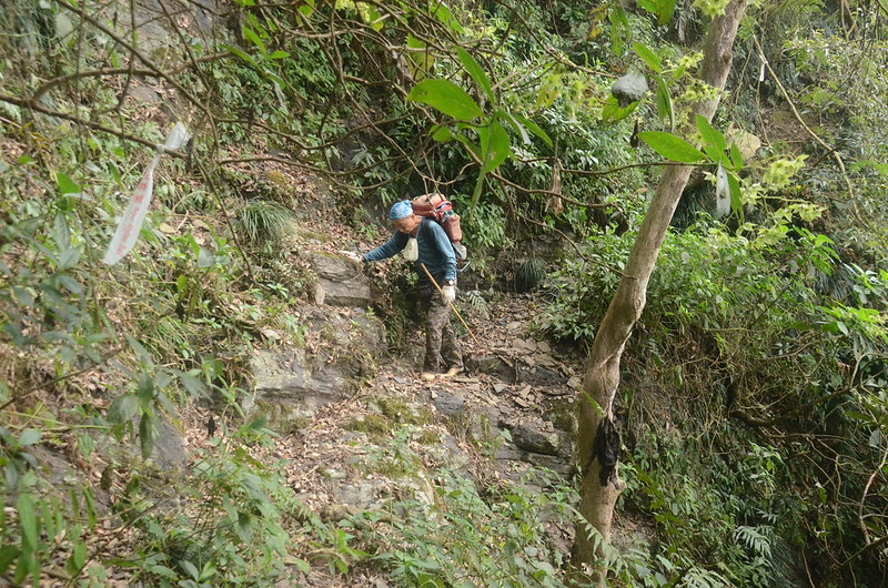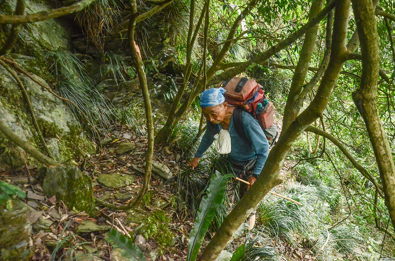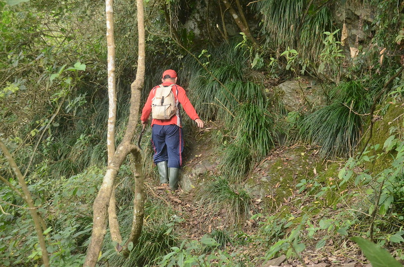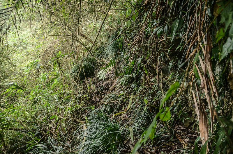 右側有點高落差,地面濕滑踏點不穩固,拉著麥門冬小心通過後續沿廢產道在山坡腰繞。