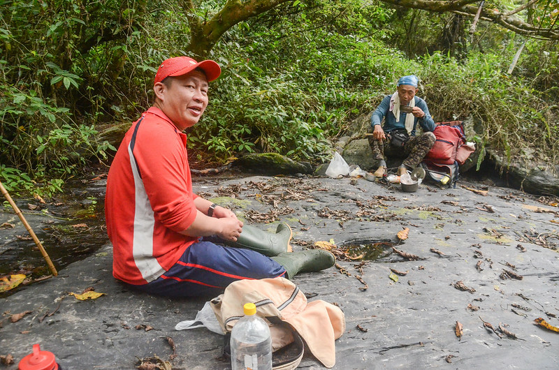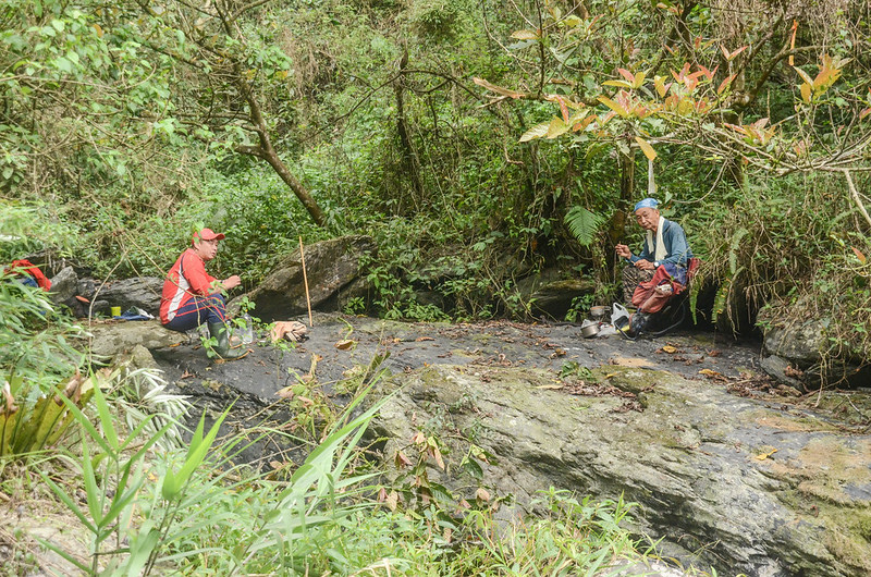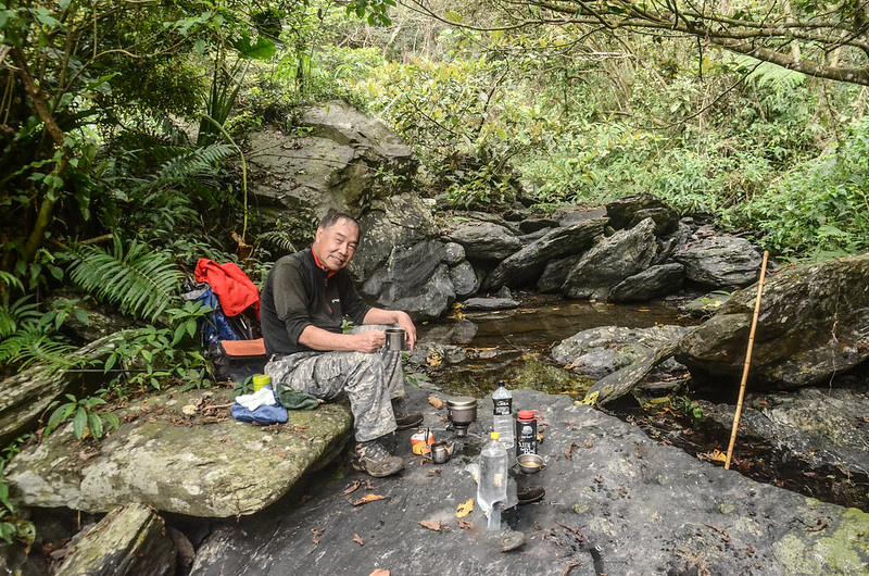 12:44 回到萬安溪支流大岩盤溪谷處午餐、泡茶、休息,足足耗了一小時再下山。