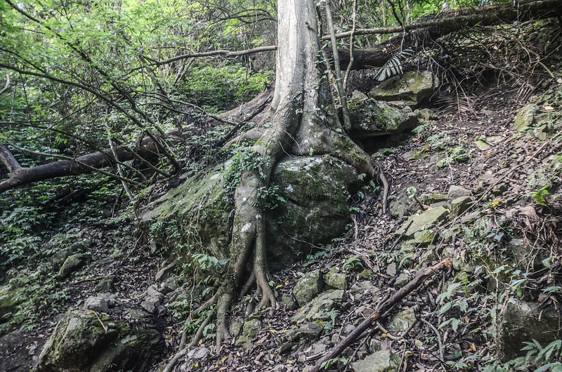 10:34 小東河步道4號救援樁,座標248722 2717441,海拔783公尺;過了4號救援樁隨即遇到一顆向右傾斜右側內凹大巨石,由巨石右側爬滿樹根藤蔓下穿過。