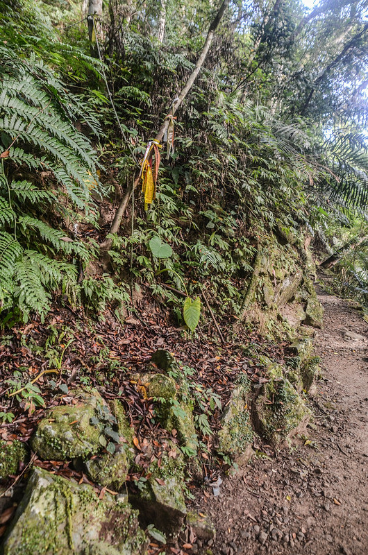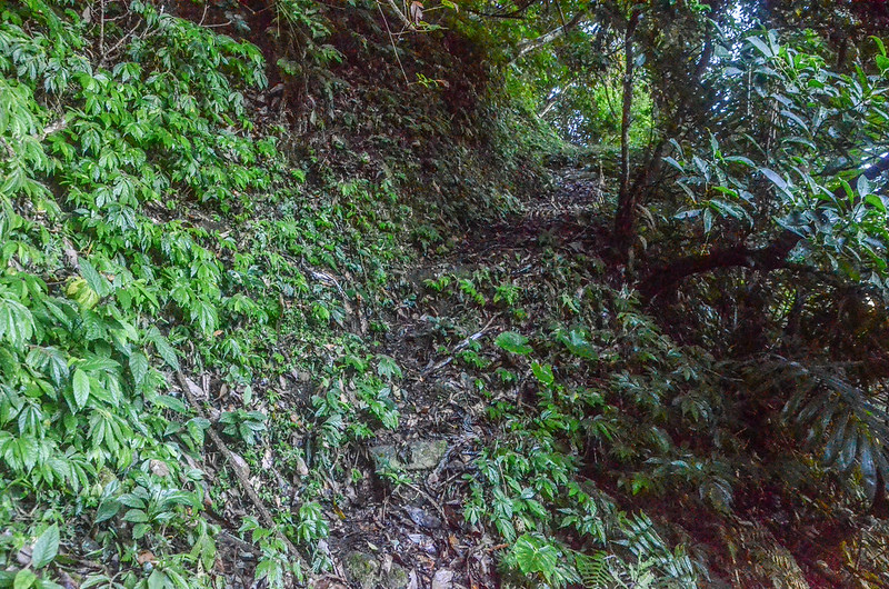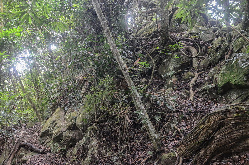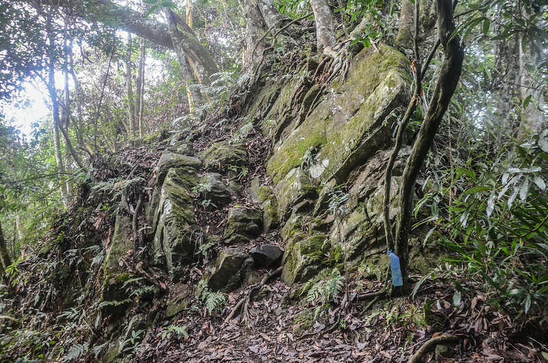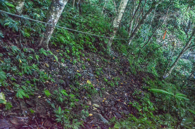 過了亂石區及平緩山徑後開始陡上,坡陡處架有輔助繩索以利攀爬。