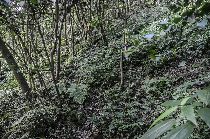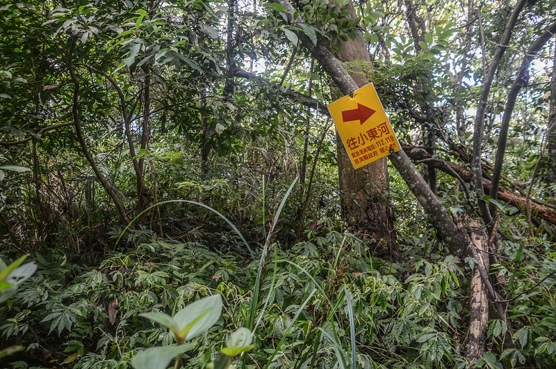步道續朝北直行可通往小東河步道北口,取左拉繩上切小東河山山徑,山徑在小東河山東北稜的東側山坡朝西往稜線上行。
