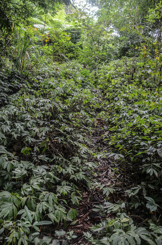 在寬稜小徑右側即是小東河步道2號救援樁,座標248945 2718015,海拔637公尺,在平坦寬稜一條類似廢產道前行近百公尺微向右切上稜線續行,陸續出現蕁麻科植物冷清草。