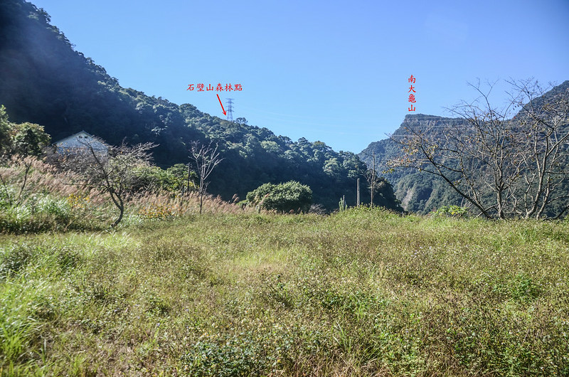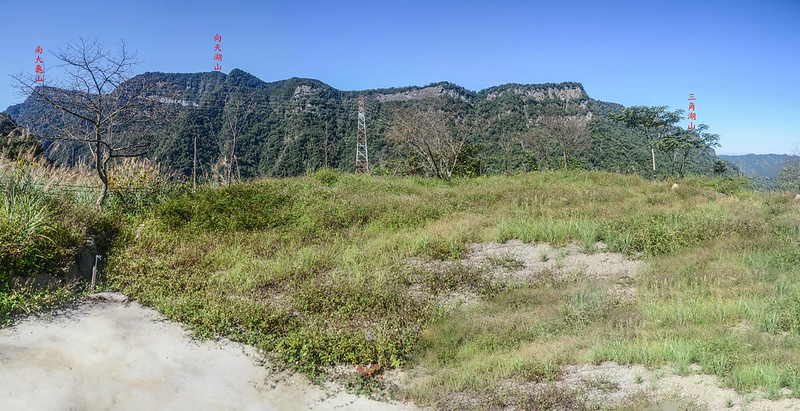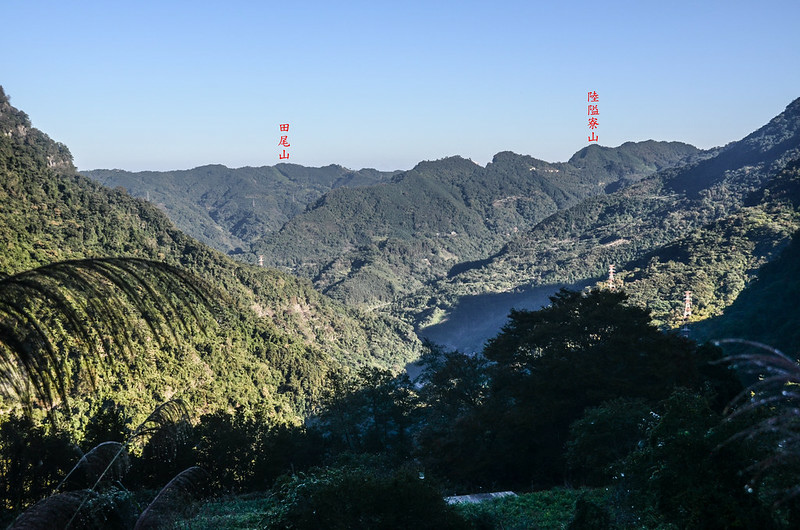 停車處展望極佳,西北望對面的向天湖山稜線,而今天要爬的石壁山即位在西南方那座高壓輸電塔旁邊。