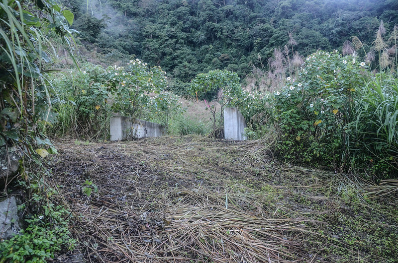 停車處沿芒草夾道的水泥產道續往下行,行約130公尺接到剛才右線上來的水泥產道,左岔上網一棟別墅,取右下行60公尺於“東河幹182支28”電線桿處左轉岔路;