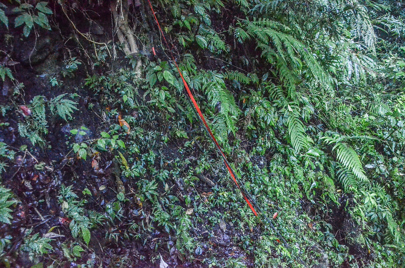小徑行約100公尺拉繩下切至第一條溪谷;
