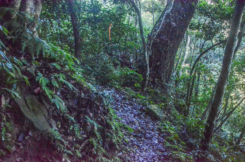 取左沿乾溪溝濕滑石頭往上走一小段路後取右上切接到路況較佳的保線路腰繞;