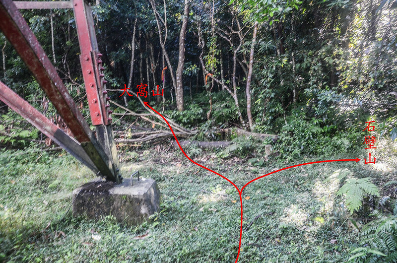 輸電塔後台電水泥基樁旁左側一條綁滿路條之山徑應是登大窩山山徑,右側一條較寬敞山徑通往石壁山森林點;