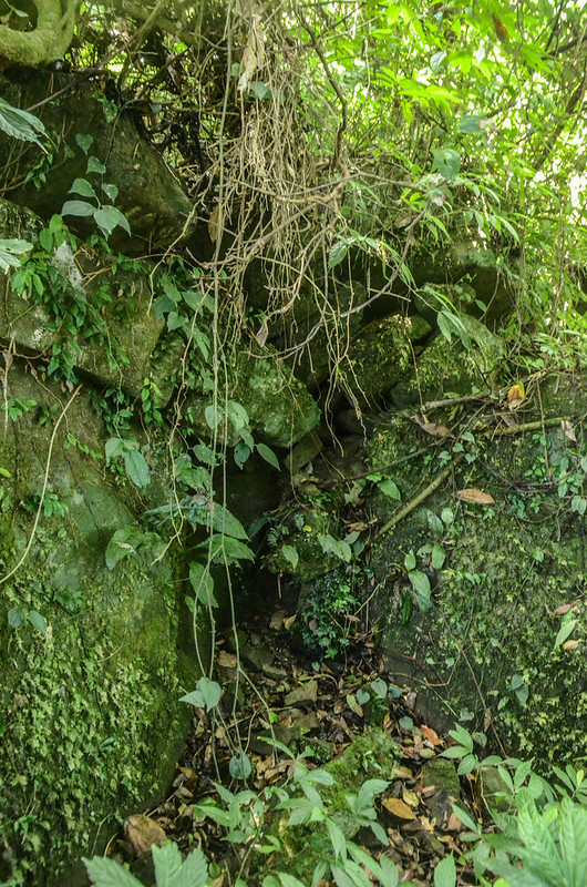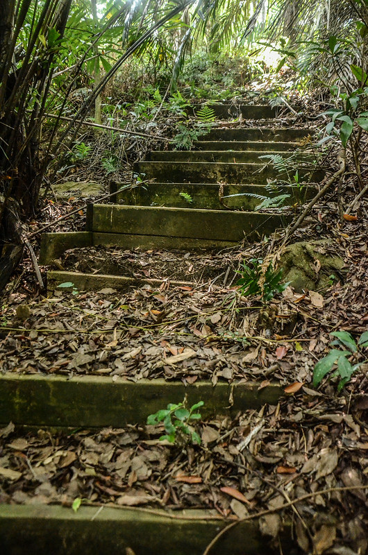 古道已完全毀棄,僅殘留片段的木階梯,古道右側絕壁下是大安溪;