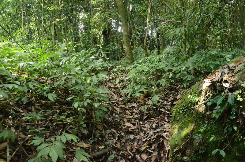 由兩座蓄水槽中間穿過隨即左切進入竹林小徑往上爬,稍有路跡。