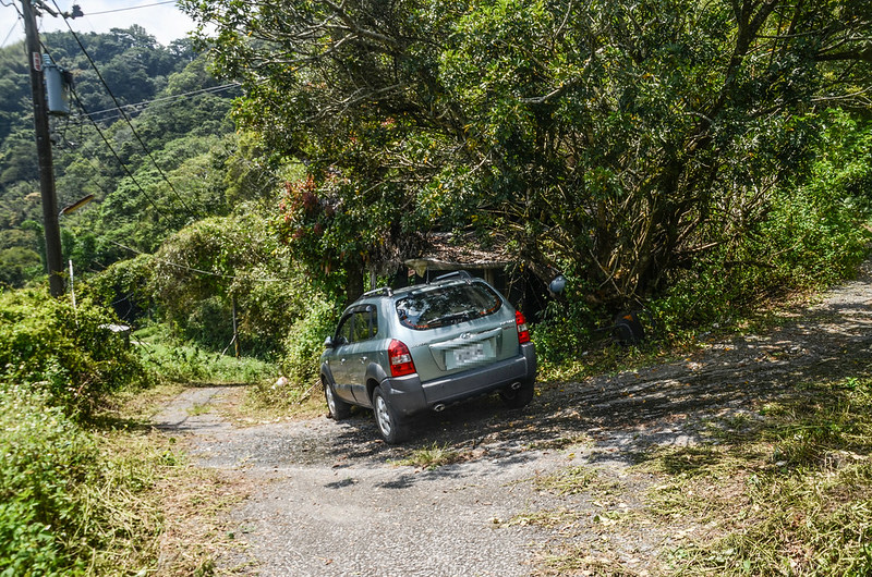 由停車處沿水泥農路續行約30公尺遇右岔果園農路,此為士林山北峰果園登山口,路左一小空地可停車;