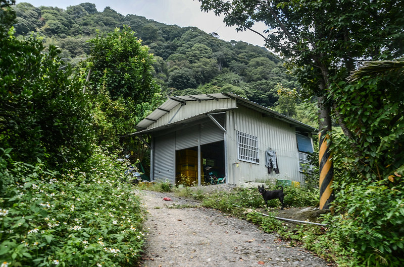 經幾次“之”字形及兩座工寮後計行約470公尺於一棟藍色工寮下方岔路處取左岔廢產道下行,座標241087 2694381,海拔872公尺;