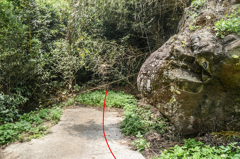廢產道行約380公尺(後80公尺為土路)路終於一塊大石處右切入竹林朝西往稜線高點上攀,座標240954 2694070,海拔845公尺;
