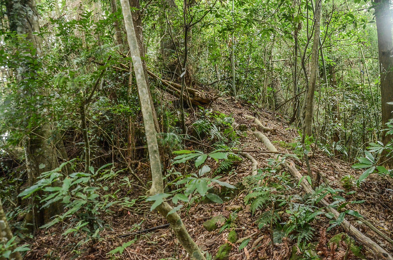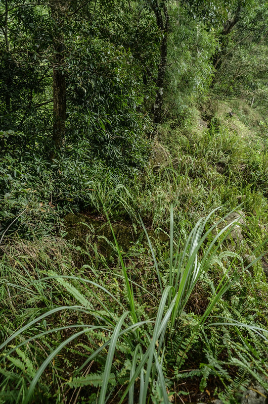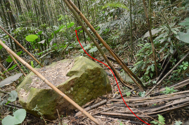 山徑很陡還好倒竹不多,拉著竹子上爬還不難走,半山腰遇一巨石峭壁由右側繞過繼續上攀;