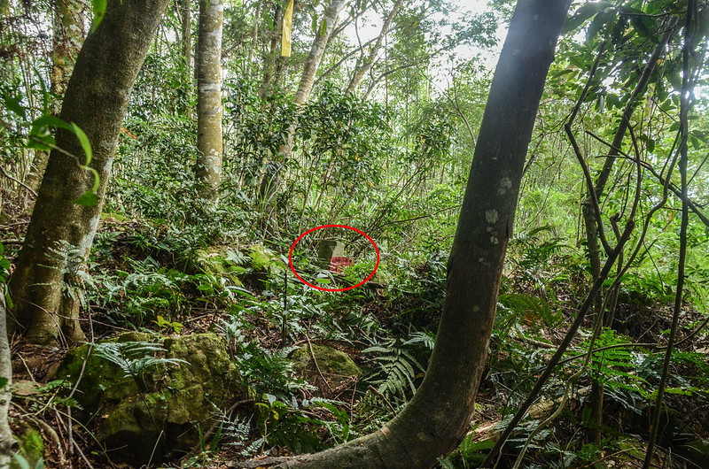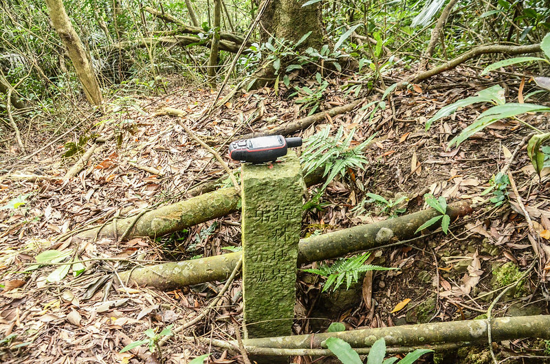 10:42 登頂細道邦山1305峰,在最高點空地找到大正十四年所立的樟林地界28號專賣局樟林地界柱,座標242279 2696740;