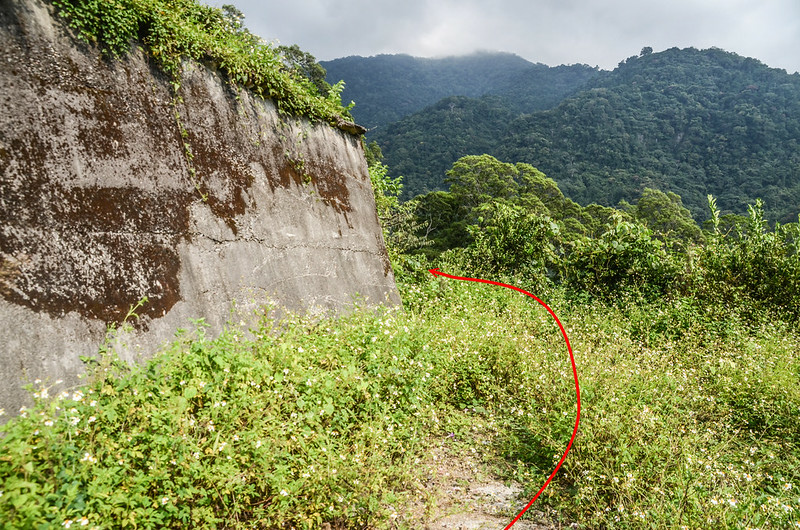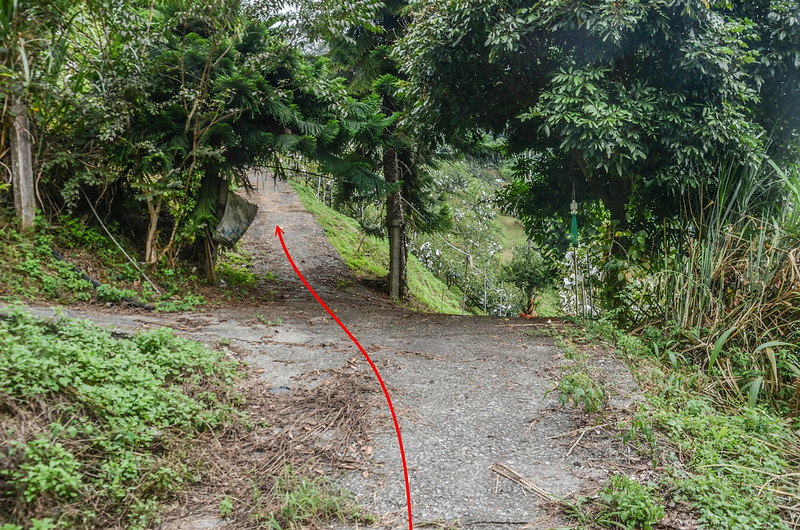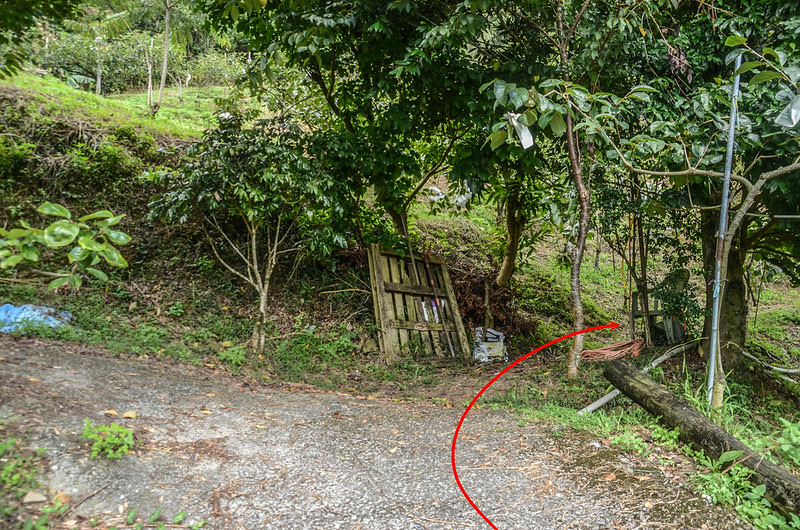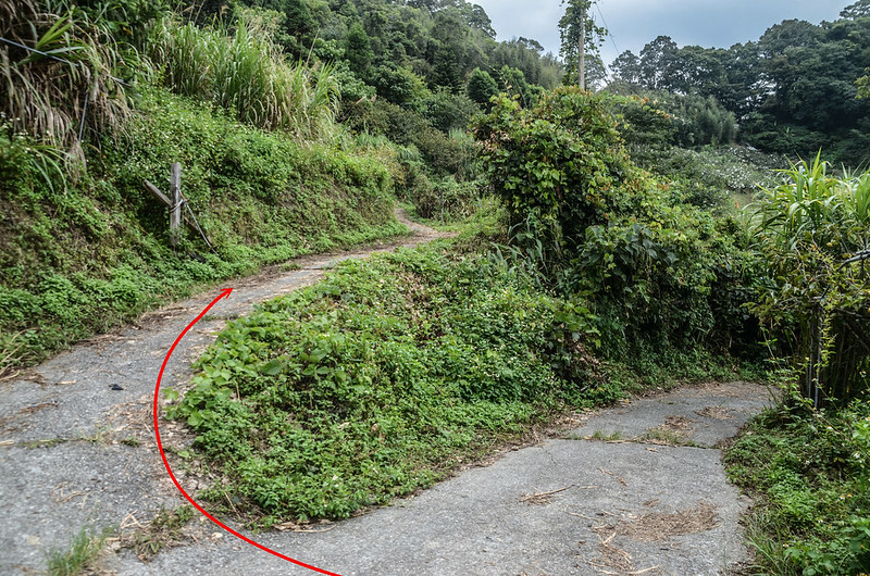 由停車處沿水泥路續行約60公尺道路終止,由大擋土牆盡頭左切入完全荒廢、長草及膝的果園往東北向爬升;