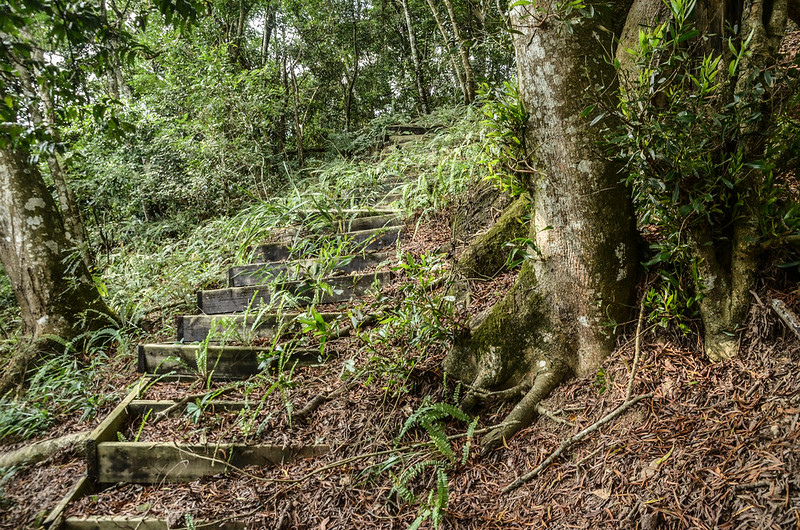 由水槽邊上到鞍部即見到已腐朽不堪的士林古道木階梯;