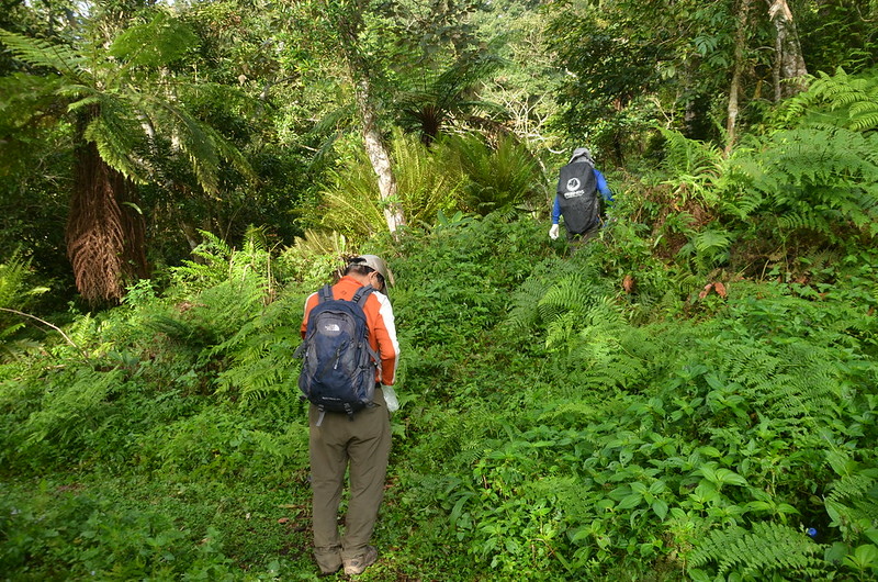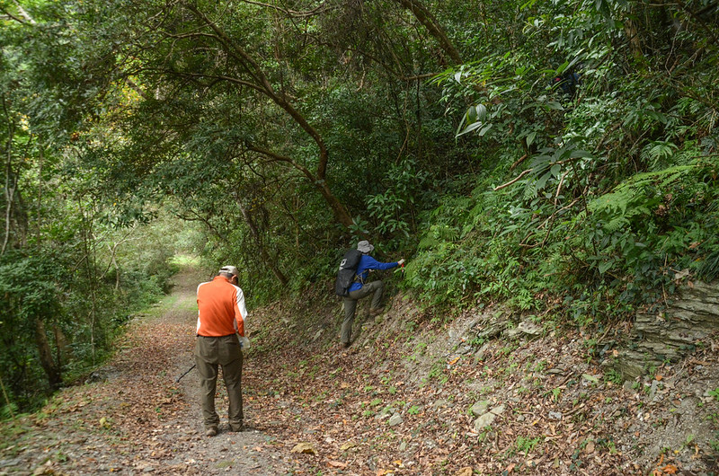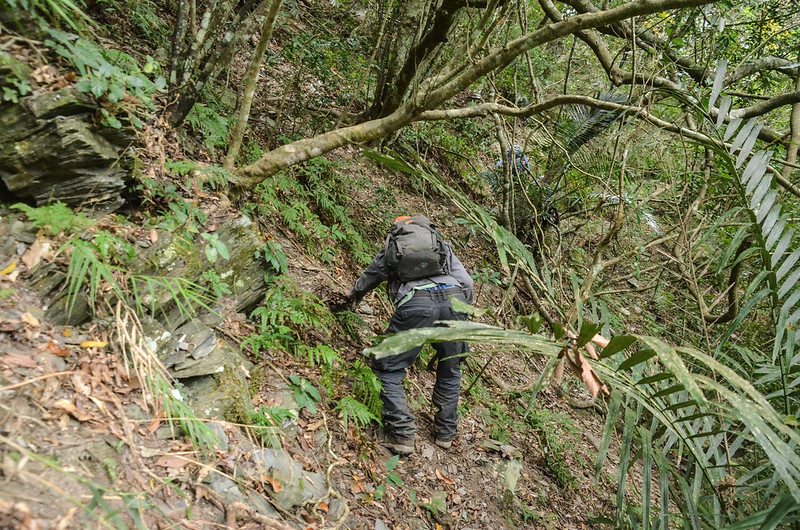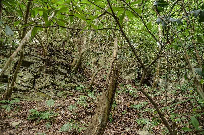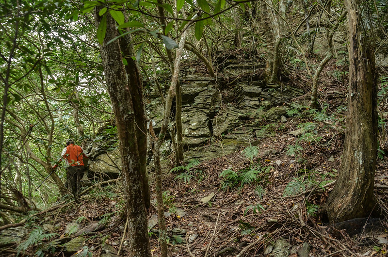 爬升約80公尺後遇前面陡峭岩石峭壁,左右兩側都可腰繞避開岩石峭壁,左線要經過崩塌地形較危險,右線較安全但有一處極陡地形要拉樹陡攀;