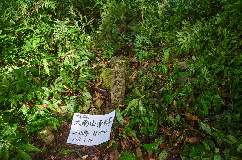 行約300公尺到肩稜山頭大南山東南峰,日據時期民政廳在此埋設一根“平山界”水泥柱,座標249122 2518100,海拔1037公尺,此水泥界標是漢人與原住民開發管理山林的分界線;