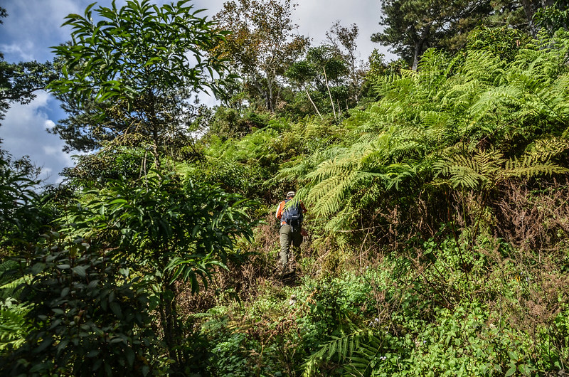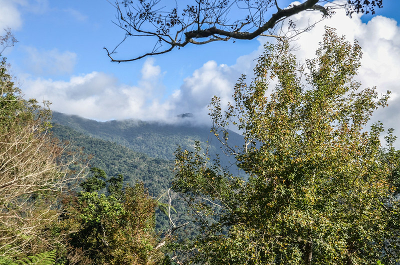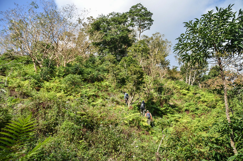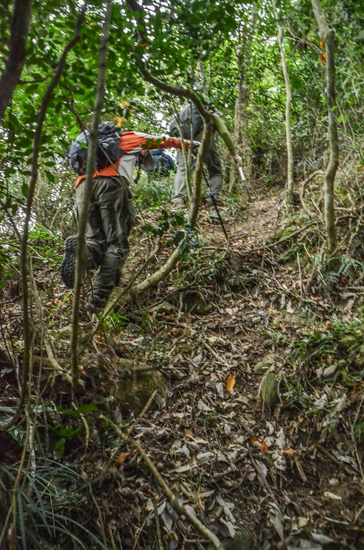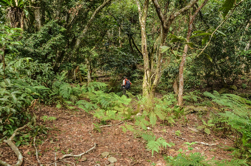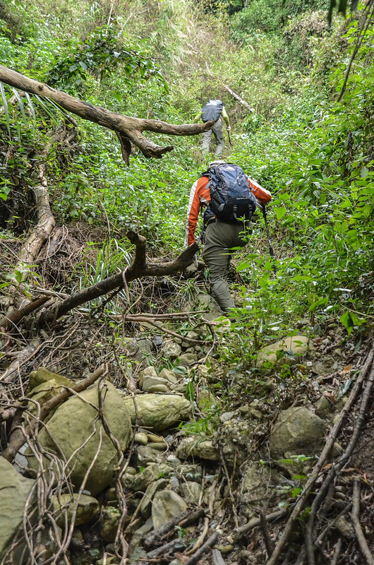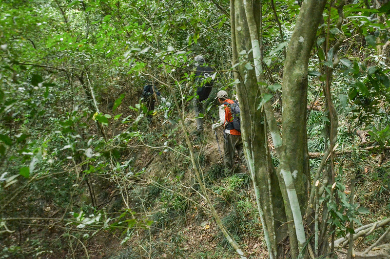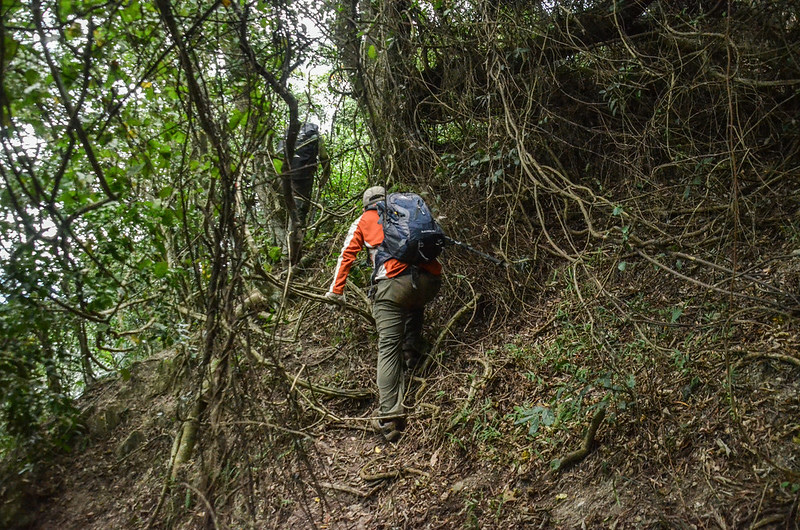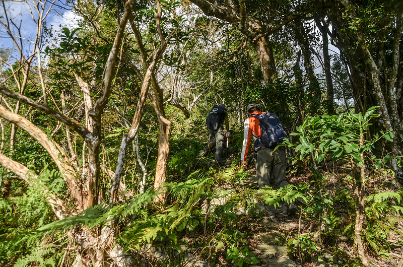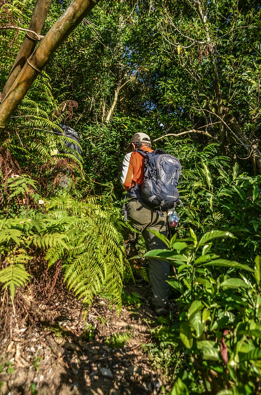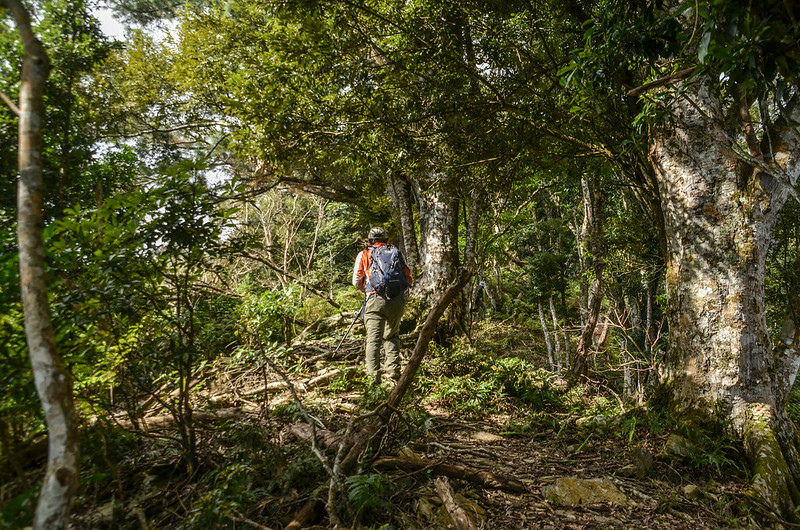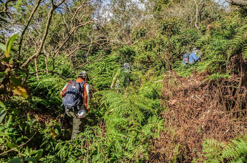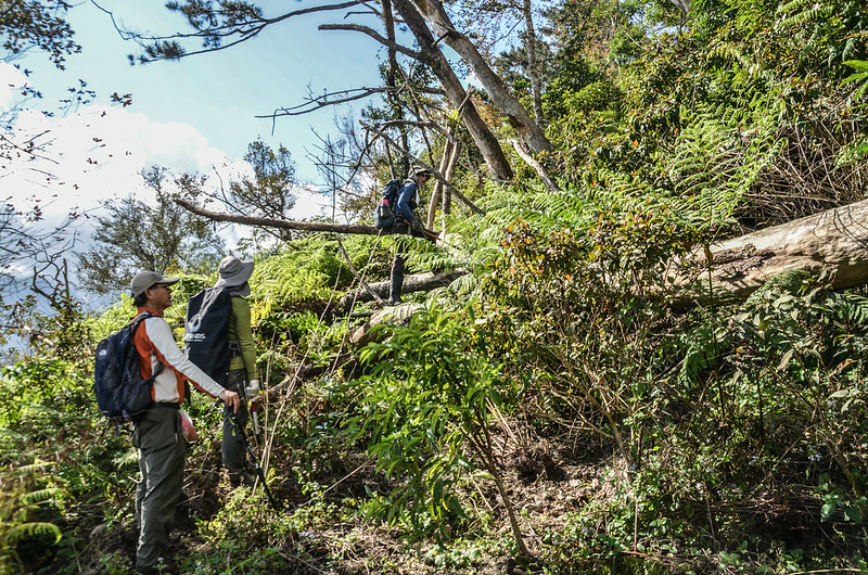 從小鞍處腰繞主稜右側(南)一段路後坡陡,越過主稜左側(北)沿北坡腰繞,北坡有蠻清楚的路跡;
