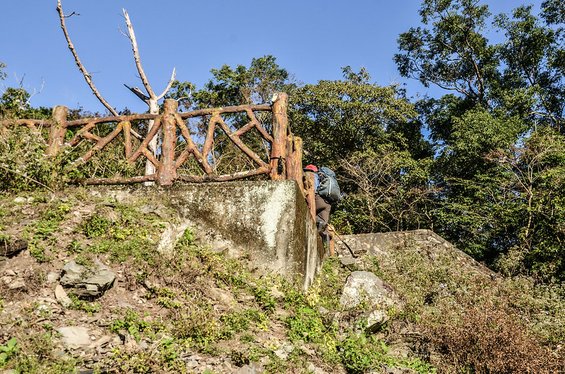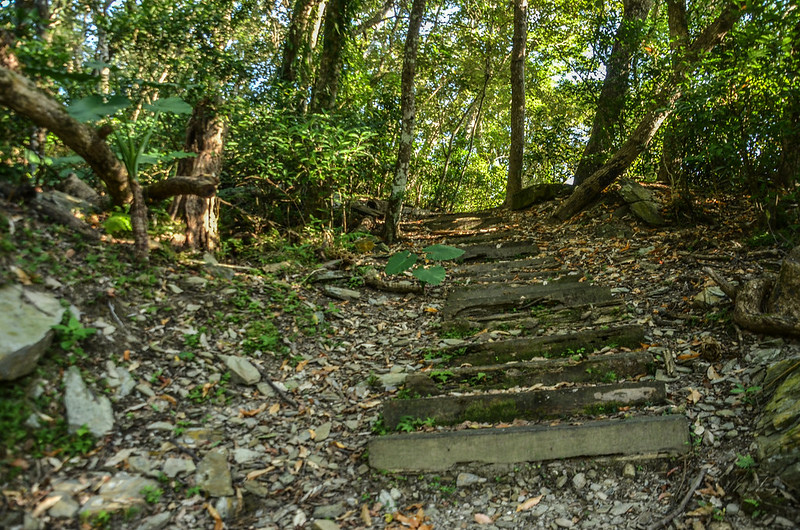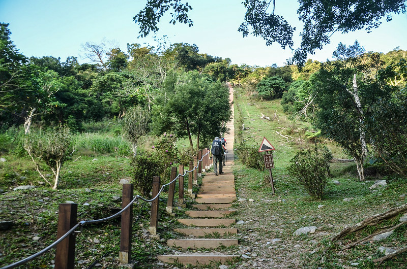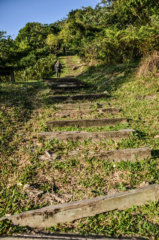 07:45 好漢坡終點,續沿榕蔭步道上行,榕蔭步道毀損維修中用黃色施工警示帶圍住,由側邊繞過續沿枕木階梯上爬。