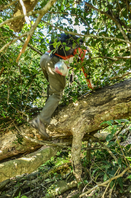 10:14 抵達大倒木區,信堯由左側開路攀越倒木上山,小楊由右側尋路上山,座標246931 2510484,海拔741公尺;兩條路在上頭交會,交會點座標246912 2510492,海拔752公尺。